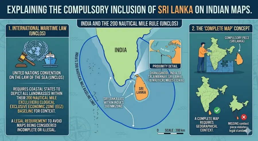 இந்தியாவின் கடைசி எல்லையான தமிழ்நாட்டின் தனுஷ்கோடியிலிருந்து இலங்கை வெறும் 18 கிமீ தூரம்தான் உள்ளது. இதன் காரணமாக கடல் சட்டத்தின்படி இந்திய வரைபடத்தில் இலங்கையை காட்டுவது கட்டாயமாகிறது.