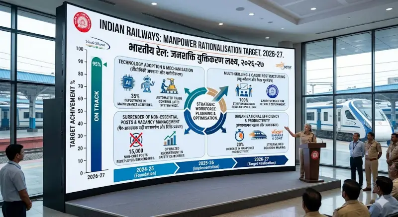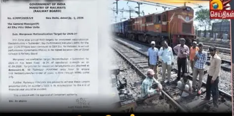 இந்திய ரயில்வே வாரியம் 24.04.2026 அன்று வெளியிட்ட சுற்றறிக்கையில் Manpower Rationalisation Target for 2026-27  என்ற திட்டத்தின் படி இந்திய நாடு முழுதும் உள்ள 13க்கும் மேற்பட்ட ரயில்வே வாரியங்களில் பணியாற்றும் பணியாளர்களை ஆட்குறைப்பு செய்ய திட்டமிட்டுள்ளதாக அறிவித்துள்ளது. அணைத்து ரயில்வே வாரிய பொது மேலாளர்களுக்கும் இந்த சுற்ற்றிக்கை அனுப்பப் பட்டுள்ளதாக தெரிகிறது.