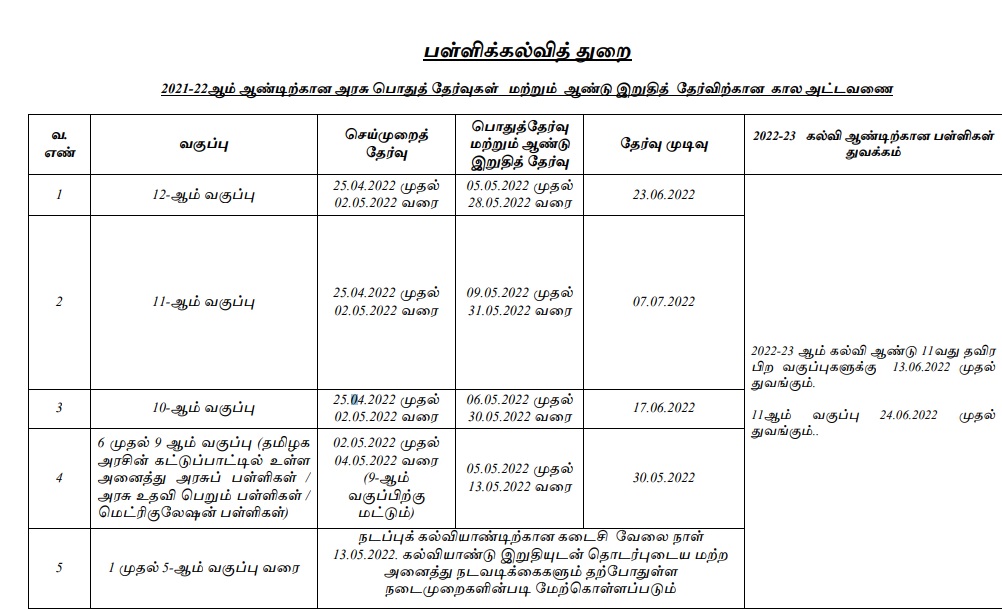 இதன்படி தமிழகத்தில் 10, 11, 12ம் வகுப்பு மாணவர்களுக்கு செய்முறை தேர்வு ஏப்ரல் 25ல் தொடங்குகிறது என்றும் பொதுத் தேர்வு மே 5ஆம் தேதி முதல் தொடங்குகிறது என்றும் அறிவிக்கப்பட்டுள்ளது .