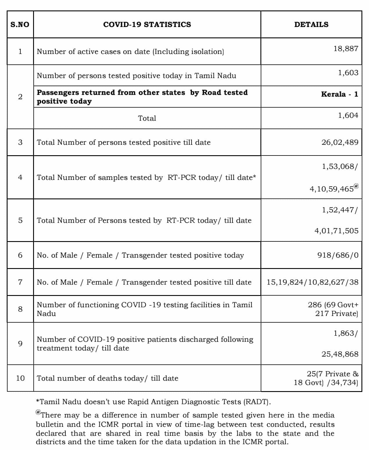 தமிழ்நாட்டில் மொத்தம் மட்டும் கொரோனாவால் பாதிக்கப்பட்டவர்கள்: 26,02,489