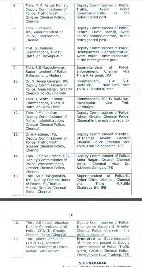 இந்த நிலையில் காவல் துறையில் 17 உயர் அதிகாரிகளை இடமாற்றம் செய்து உள்துறை செயலாளர் உத்தரவு பிறப்பித்துள்ளார். மேலும் புதிதாக உருவாக்கப்பட்ட தாம்பரம், ஆவடி மாநகர காவல் ஆணையரகங்களுக்கு 8 துணை ஆணையர்கள் நியமனம் செய்யப்பட்டுள்ளனர் என்றும் போக்குவரத்து, சட்டம் ஒழுங்கு, கிரைம் பிரிவு, நிர்வாகம் என தலா நான்கு துணை ஆணையர்கள் நியமிக்கப்பட்டுள்ளனர் என்று உள்துறை செயலாளர் அறிவித்துள்ளார்