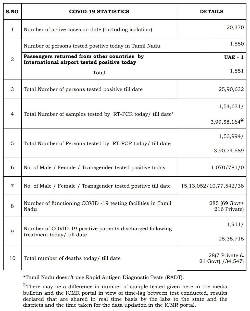 தமிழ்நாட்டில் இன்று மட்டும் கொரோனாவால் பாதிக்கப்பட்டவர்கள்: 1,851