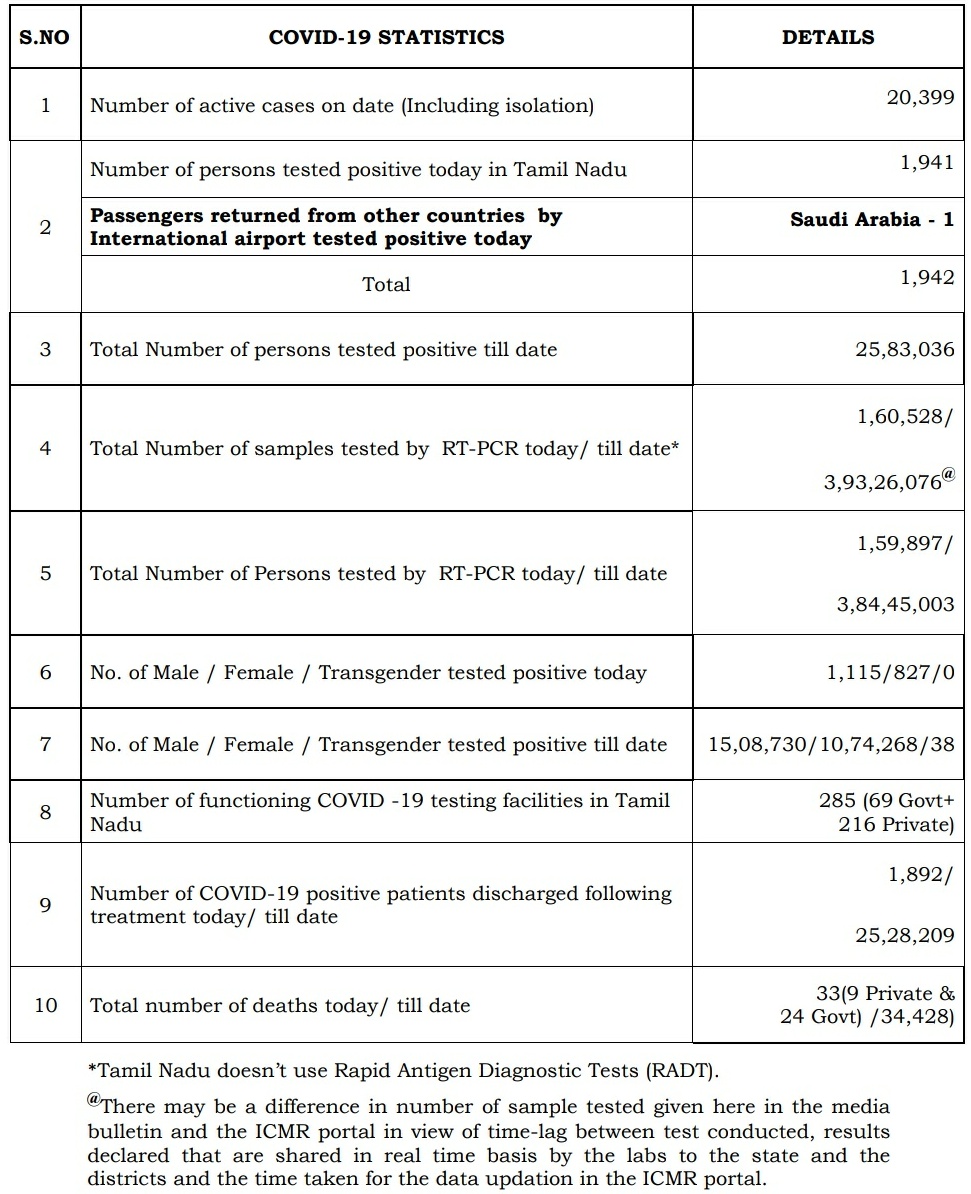 தமிழ்நாட்டில் மொத்தம் மட்டும் கொரோனாவால் பாதிக்கப்பட்டவர்கள்: 25,83,036