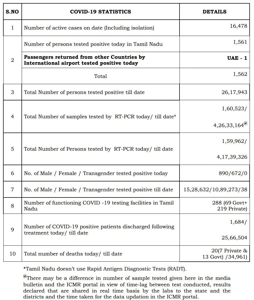 தமிழ்நாட்டில் இன்று மட்டும் கொரோனாவால் பாதிக்கப்பட்டவர்கள்: 1,562