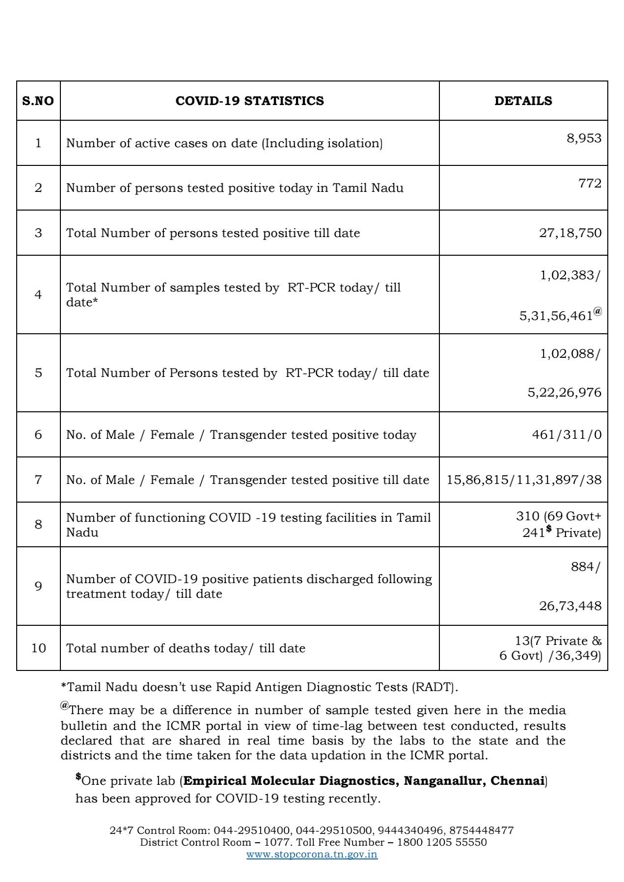 தமிழ்நாட்டில் மொத்தம் மட்டும் கொரோனாவால் பாதிக்கப்பட்டவர்கள்: 27,18,750
