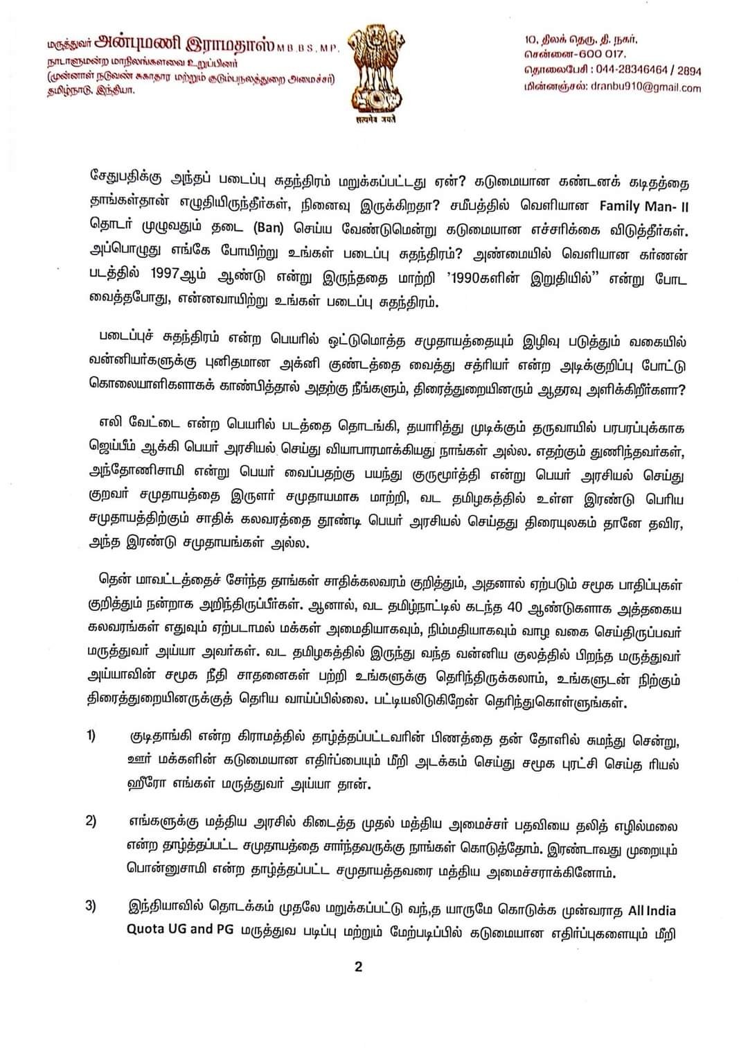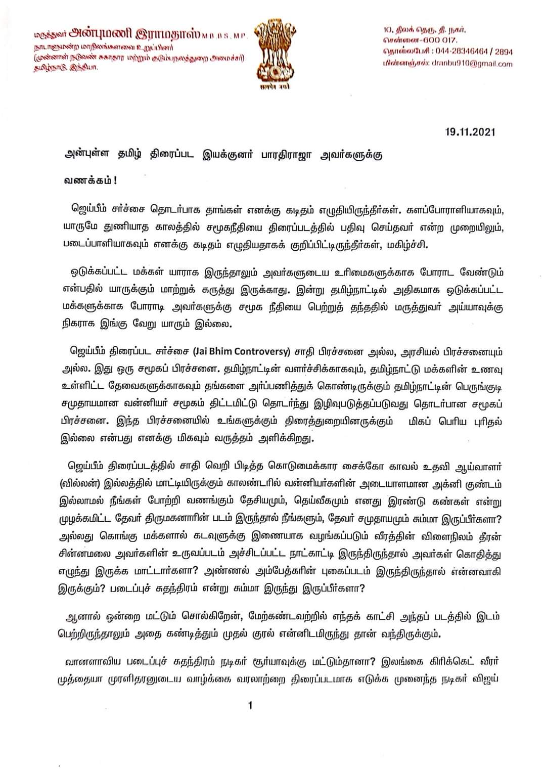 சூர்யா நடித்த ஜெய்பீம் பட விவகாரம் கடந்த சில நாட்களாக இணைய தளங்களில் பெரும் பரபரப்பை ஏற்படுத்தி வரும் நிலையில் பாமக இளைஞரணி தலைவர் அன்புமணி ராமதாஸ் அவர்கள் சமீபத்தில் சூர்யாவுக்கு ஒரு கடிதம் எழுதியிருந்தார். இந்த கடிதத்திற்கு சூர்யா பதில் கடிதம் அனுப்பி இருந்தார் என்பது குறிப்பிடத்தக்கது.