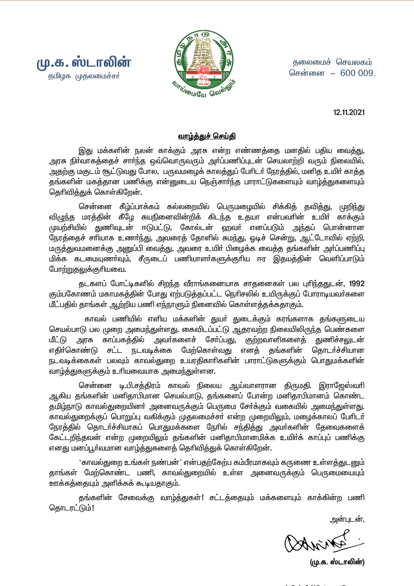 இந்த நிலையில் காவல் ஆய்வாளர் ராஜேஸ்வரி அவர்களை முதலமைச்சர் முக ஸ்டாலின் அவர்கள் நேரில் அழைத்து பாராட்டியுள்ளார். இதுகுறித்து அவர் தனது டுவிட்டர் பக்கத்தில் கூறியிருப்பதாவது: எத்தனை இடர் வரினும் இருள் சூழினும் மனிதநேயம் எனும் மணிவிளக்கின் ஒளி அவற்றைப் போக்கி புது நம்பிக்கையை அளிக்கிறது! உதயா என்பவரின் உயிரைக் காப்பாற்றிய டி.பி.சத்திரம் காவல் நிலைய ஆய்வாளர் திருமதி. இராஜேஸ்வரி அவர்களின் செயல் அத்தகைய ஒளியே!