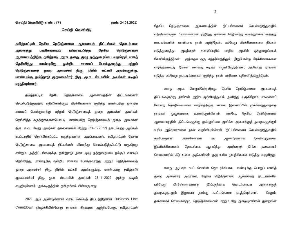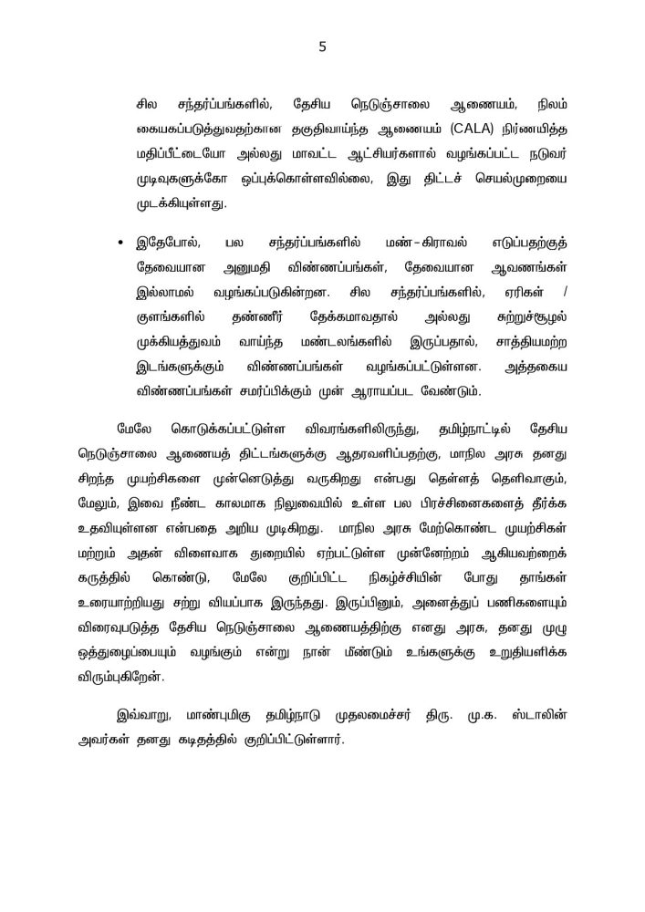 தமிழ்நாட்டில் தேசிய நெடுஞ்சாலை ஆணைய திட்டங்கள் தொடர்பான அனைத்து பணிகளையும் விரைவுபடுத்த தேசிய நெடுஞ்சாலை ஆணையத்திற்கு தமிழ்நாடு அரசு முழு ஒத்துழைப்பு வழங்கும் என்றும் தெரிவித்து முதலமைச்சர் மு க ஸ்டாலின் அவர்கள் கடிதம் எழுதியுள்ளார். அந்த கடிதத்தில் முதல்வர் கூறியிருப்பதாவது: