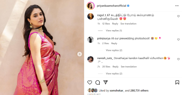 எங்களோட ப்ரீ வெட்டிங் போட்டோஷூட்டில் எடுத்த புகைப்படங்கள் தான் இது என்று ஒரு ஜொள்ளுப் பார்ட்டி ரசிகரும், கடத்திட்டுப் போய் கல்யாணம் பன்னிருவேன் என ராகுல் என்கிற நெட்டிசனும் கமெண்ட் போட்டு பிரியங்கா மோகனின் அழகில் மயங்கிப் போயுள்ளனர்.