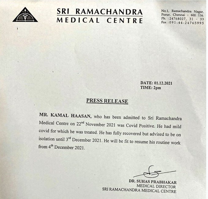 கடந்த 22ஆம் தேதி கமலஹாசன் கொரோனாவால் பாதிக்கப்பட்டு தனியார் மருத்துவமனையில் அனுமதிக்கப்பட்டு சிகிச்சை பெற்று வருகிறார் என்பதும் அவரது உடல்நிலை தேறி வருவதாக அவ்வப்போது மருத்துவமனை நிர்வாகம் அறிக்கைகளை வெளியிட்டு வந்தது என்பதும் தெரிந்ததே.