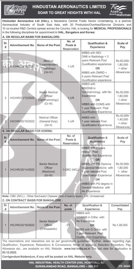 HAL நிறுவனத்தில் காலியாக உள்ள பணியிடங்களை அதிகாரப்பூர்வ அறிவிப்பு வெளியாகியுள்ளது. இதற்குத் தகுதியும் விருப்பமும் உள்ள விண்ணப்பிக்கலாம்.
