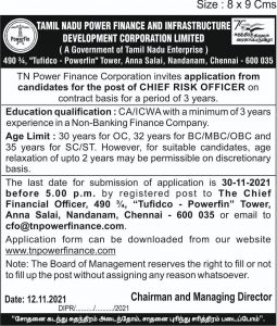 தமிழ்நாடு மின்சாரம் நிதி மற்றும் உள்கட்டமைப்பு மேம்பாட்டு கார்ப்பரேஷன் லிமிடெட்டில் காலியாக உள்ள பணியிடங்களை அதிகாரப்பூர்வ அறிவிப்பு வெளியாகியுள்ளது. இதற்குத் தகுதியும் விருப்பமும் உள்ளவர்கள் விண்ணப்பிக்கலாம்.