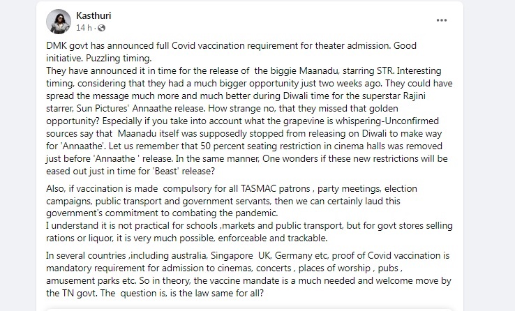 இந்த நிலையில் இந்த விவகாரம் குறித்து நடிகை கஸ்தூரி தனது பேஸ்புக் பக்கத்தில் நீண்ட பதிவு ஒன்றை செய்துள்ளார். அதில் அவர் கூறியிருப்பதாவது: திரையரங்கில் ரசிகர்களை அனுமதிக்க தடுப்பூசி அவசியம் என்று திமுக அரசு அறிவித்துள்ளது நல்ல முயற்சி. ஆனால் சிம்பு நடித்த மாநாடு ரிலீஸின்போது இதை அறிவிக்காமல் ரஜினி நடித்த ’அண்ணாத்த’ படத்தின் ரிலீஸின்போது அறிவித்து இருந்தால் இன்னும் சிறப்பாக இருந்து இருக்கும்/ அந்த பொன்னான வாய்ப்பை அரசு தவறி விட்டது ஏன் என்று கேள்வி எழுப்பி உள்ளார் .