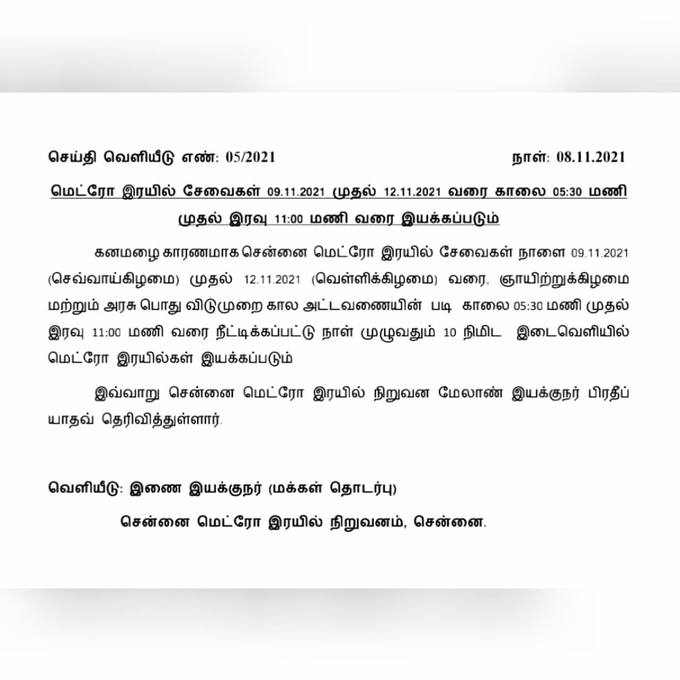 கனமழை காரணமாக சென்னை மெட்ரோ ரயில் சேவைகள் நாளை முதல் 12ஆம் தேதி வரை ஞாயிற்றுக்கிழமை மற்றும் அரசு பொது விடுமுறை கால அட்டவணையின்படி ரயில்கள் இயக்கப்படும் என்றும், அதாவது நாளை முதல் காலை ஐந்து முப்பது மணி முதல் இரவு 11 மணி வரை மெட்ரோ ரயில்கள் இயங்கும் என்றும் ஒவ்வொரு நாளும் பத்து நிமிட இடைவெளியில் மெட்ரோ ரயில்கள் இயக்கப்படும் என்றும் மெட்ரோ ரயில் நிறுவன மேலாண்மை இயக்குநர் படுத்திய அவர்கள் தெரிவித்துள்ளார்.