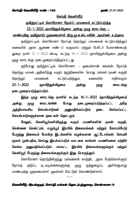 கொரோனா வைரஸ் மற்றும் ஒமிக்ரான் வைரஸ் காரணமாக தமிழகத்தில் ஞாயிறு அன்று முழு ஊரடங்கு மற்றும் திங்கள் முதல் சனி வரை இரவு நேர ஊரடங்கு அமல்படுத்தப்பட்டு உள்ளது என்பது தெரிந்தது. அந்த வகையில் வரும் ஜனவரி 23ஆம் தேதி ஞாயிறு அன்று முழு ஊரடங்கு அமல் படுத்தப்படும் என தமிழக அரசு அறிவித்துள்ளது. ஆனால் அதே நேரத்தில் ஒரு சில தளர்வுகள் அறிவிக்கப்பட்டு உள்ளது என்பது குறிப்பிடத்தக்கது.