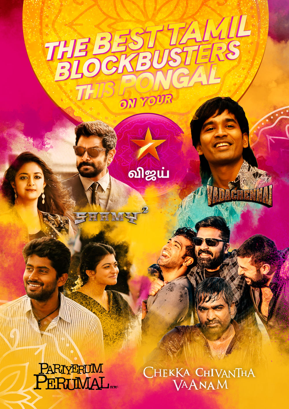 சன் டிவியில் இப்படி யென்றால், விஜய் டிவியிலோ வரும் ஜனவரி 15ம் தேதி விக்ரமின் சாமி 2, தனுஷின் வடசென்னை, பரியேறும் பெருமாள் மற்றும் சந்தானத்தின் சக்கப்போடு போடு ராஜா படங்களை ஒளிபரப்ப உள்ளனர்.