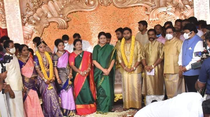 இந்த நிலையில் சற்று முன்னர் இந்த திருமணத்திற்கு கலந்து கொள்ள சசிகலா வருகை தந்தார். அவர் அதிமுக கொடி கட்டப்பட்ட காரில் இந்த திருமணத்திற்கு வருகை தந்தது பெரும் பரபரப்பை ஏற்படுத்தியது. சசிகலா மணமக்களுக்கு தனது ஆசையை வழங்கினார். மேலும் திருமணம் முடியும்வரை அவர் திருமண நிகழ்ச்சியில் கலந்து கொள்ள முடிவு செய்துள்ளார்.