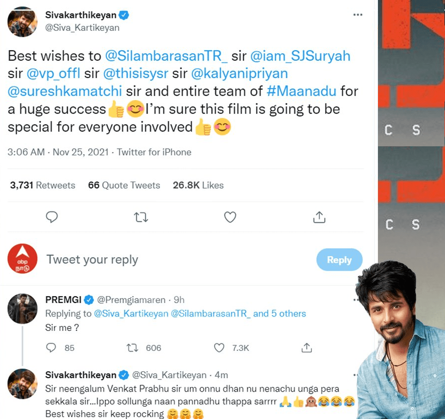 இந்த நிலையில் மாநாடு படக்குழுவினர்களுக்கு வாழ்த்து தெரிவிக்கும் வகையில் நடிகர் சிவகார்த்திகேயன் தனது டுவிட்டரில் டுவிட் ஒன்றை பதிவு செய்தார். அதில் சிம்பு, எஸ்ஜே சூர்யா, வெங்கட் பிரபு, யுவன் சங்கர் ராஜா, கல்யாணி பிரியதர்ஷன், சுரேஷ் காமாட்சி ஆகியோர்களுக்கு மாநாடு திரைப்படம் வெற்றி பெற எனது வாழ்த்துக்கள் என்றும் இந்த திரைப்படம் கண்டிப்பாக மிகப்பெரிய வெற்றி பெறும் என்றும் அவர் தெரிவித்திருந்தார்.