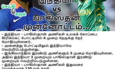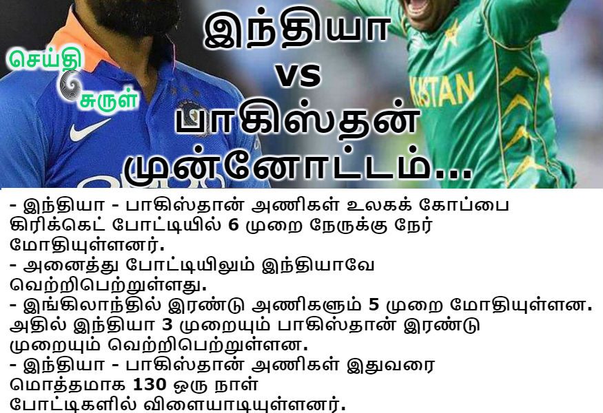 1) இந்தியா – பாகிஸ்தான் அணிகள் உலகக் கோப்பை கிரிக்கெட் போட்டியில் 6 முறை நேருக்கு நேர் மோதியுள்ளனர். 2) அனைத்து போட்டியிலும் இந்தியாவே வெற்றிபெற்றுள்ளது. 3) இங்கிலாந்தில் இரண்டு அணிகளும் 5 முறை மோதியுள்ளன....