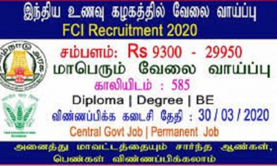 இந்திய உணவு கழகத்தில் மண்டலம் வாரியாகக் காலியிடங்கள் 585 உள்ளது. இதில் இளநிலை பொறியாளர், சுருக்கெழுத்தாளர் கிரேடு II, தட்டச்சர் (ஹிந்தி), கணக்காளர், டெக்னிக்கல் ஆகிய பிரிவுகளில் வேலைக்கான அறிவிப்பு வெளியிடப்பட்டுள்ளது. இதற்கு விண்ணப்பியுங்கள். மொத்த...