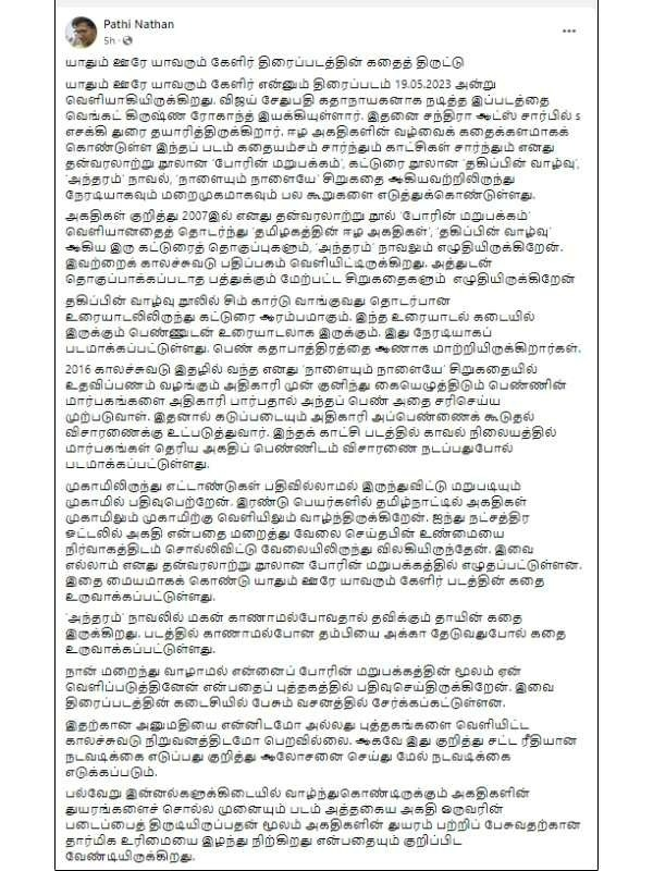 அந்தரம்’ நாவலில் மகன் காணாமல்போவதால் தவிக்கும் தாயின் கதை இருக்கிறது. படத்தில் காணாமல் போன தம்பியை அக்கா தேடுவதுபோல் கதை உருவாக்கப்பட்டுள்ளது. நான் மறைந்து வாழாமல் என்னைப் போரின் மறுபக்கத்தின் மூலம் ஏன் வெளிப்படுத்தினேன் என்பதைப் புத்தகத்தில் பதிவுசெய்திருக்கிறேன். இவை திரைப்படத்தின் கடைசியில் பேசும் வசனத்தில் சேர்க்கப்பட்டுள்ளன. இதற்கான அனுமதியை என்னிடமோ அல்லது புத்தகங்களை வெளியிட்ட காலச்சுவடு நிறுவனத்திடமோ பெறவில்லை. ஆகவே இது குறித்து சட்ட ரீதியான நடவடிக்கை எடுப்பது குறித்து ஆலோசனை செய்து மேல் நடவடிக்கை எடுக்கப்படும் என பதிவிட்டுள்ளார்.